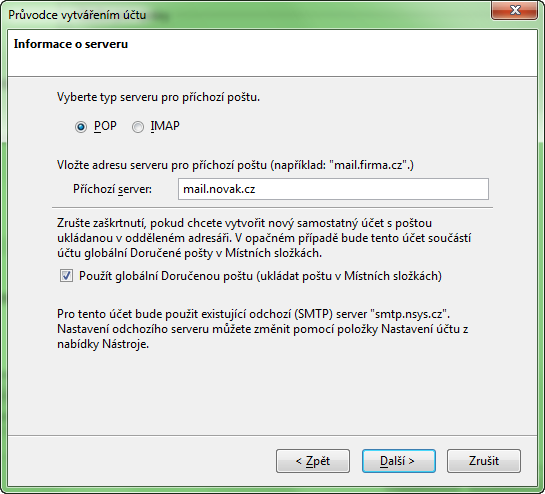 - Vyplňte příchozí poštovní server, v tomto případě mail.novak.cz, zvolte typ serveru POP (pokud potřebujete IMAP, zvolte IMAP). Stisknětě tlačítko Další.